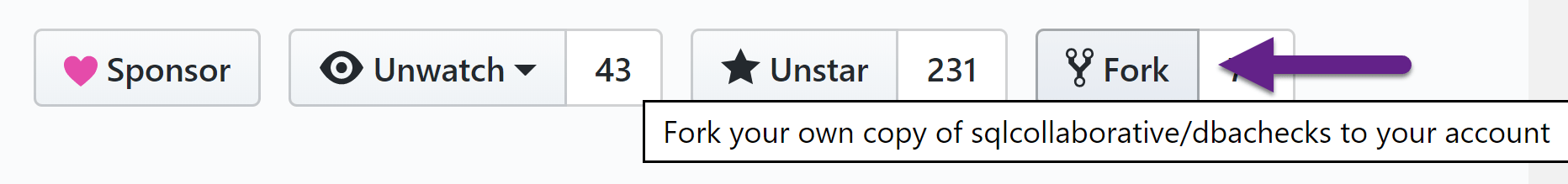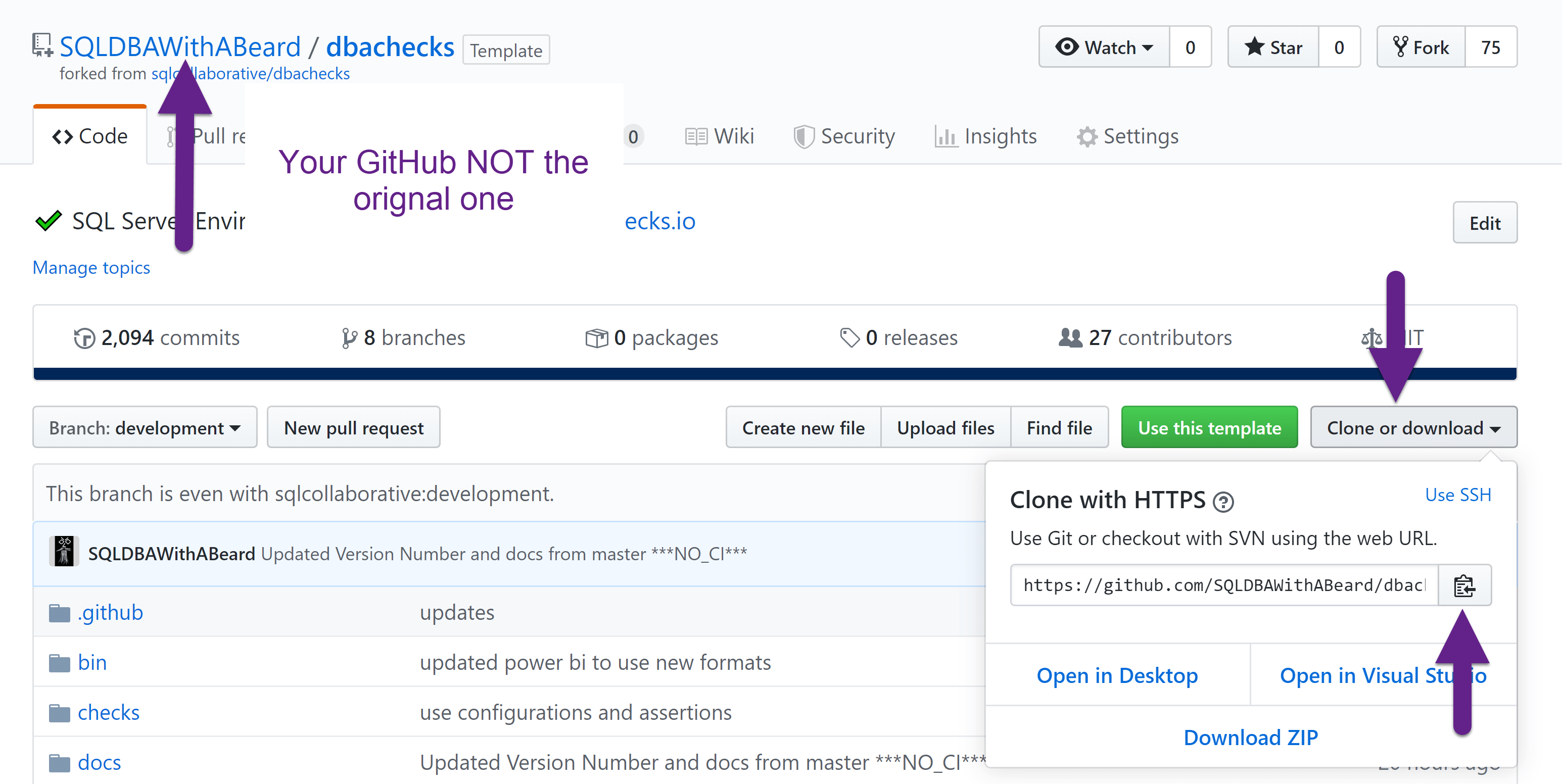 The page will open at https://github.com/YOURGITHUBUSERNAME/NameOfRepository in this case https://github.com/SQLDBAWithABeard/dbachecks You will be able to see that it is a fork of the original repository at the top of the page