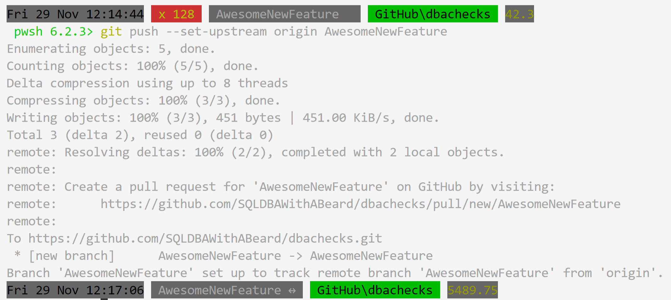 fatal: The current branch AwesomeNewFeature has no upstream branch.