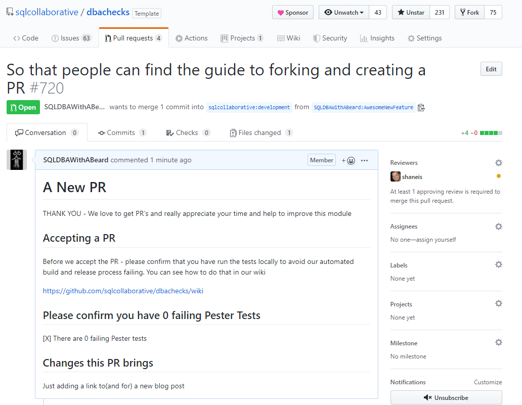 Now that the required changes for the review have been made, the review has been approved by Shane and the pull request is now ready to be merged. (You can also see that dbachecks runs some checks against the code when a Pull Request is made)